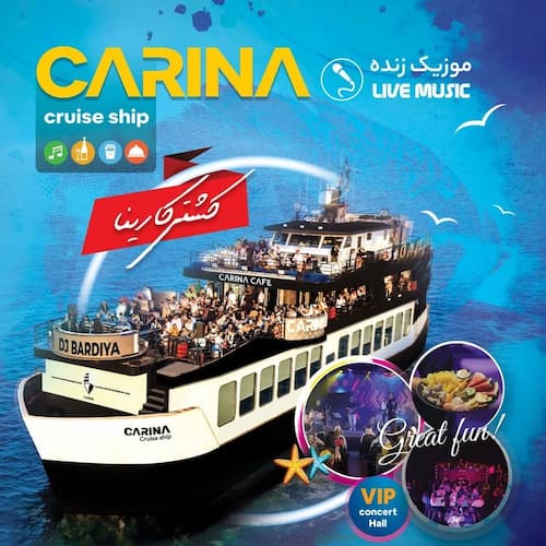 کشتی کارینا کیش یکی از جدیدترین های کشتی تفریحی کیش می باشد که از سال 1401 در جزیره زیبای کیش راه اندازی شده است. کشتی کارینا کیش یک کشتی بی نظیر دارای یک استیج کنسرتی با ظرفیت برگزاری یک کنسرت روی آب و همچنین عرشه های متفاوت و دیدنی به همراه یک کافی شاپ منحصر بفرد که در جزیره کیش بی رقیب است توانسته در مدت کوتاهی به یکی از محبوب ترین کشتی های تفریحی کیش تبدیل شود. همچنین کیفیت شام (درصورتی که سانس با شام باشد) نیز در این کشتی متفاوت است که در پک های بهداشتی به همراه نوشیدنی برای هر نفر سرو می شود.